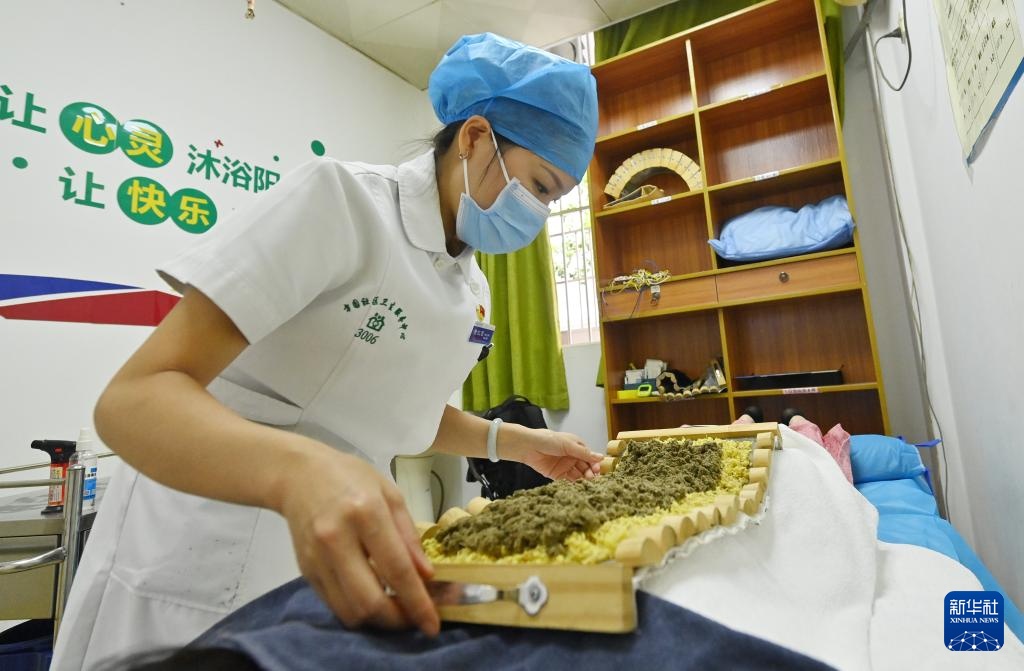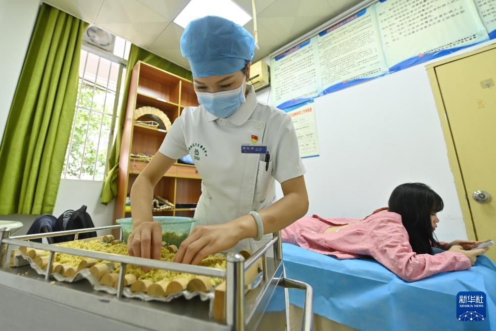 8月9日,在广西南宁市青秀区方园社区卫生服务中心,医务人员准备给市民做督脉灸。