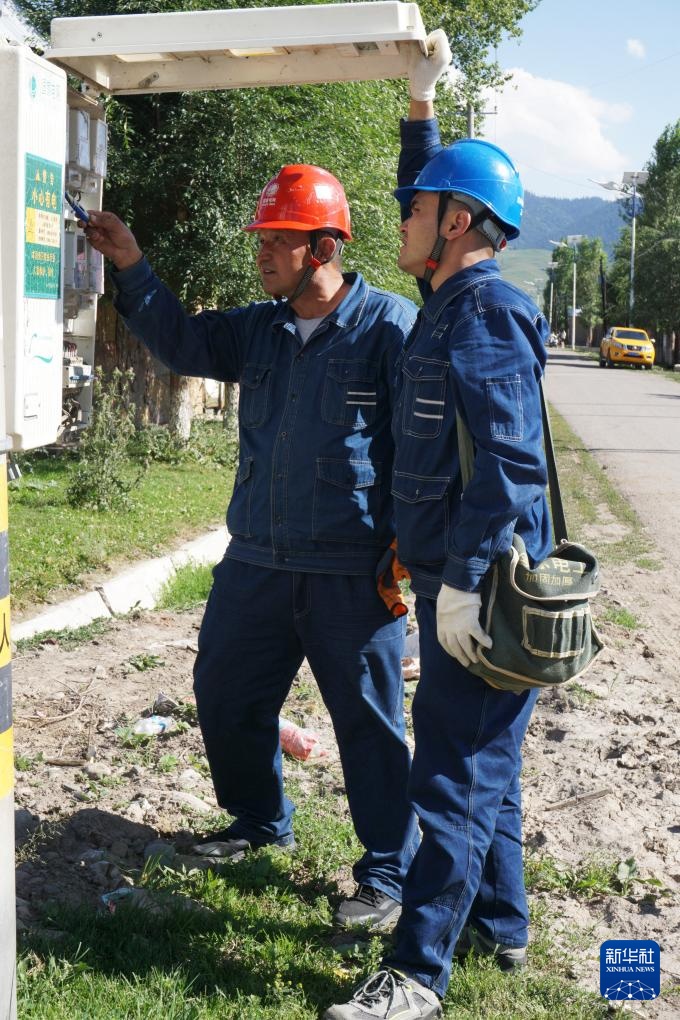 阿曼吐尔·依沙木丁(左)和同事在2025新疆伊犁天马文化旅游节活动现场开展保电工作(7月19日摄)。