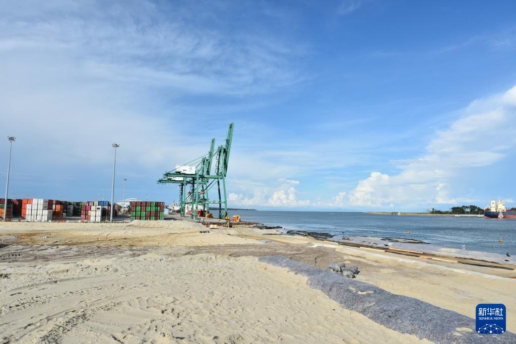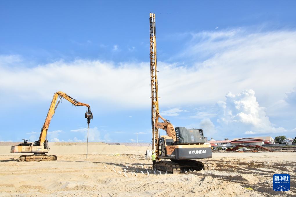 这是8月8日拍摄的文莱摩拉港集装箱码头扩建施工现场。