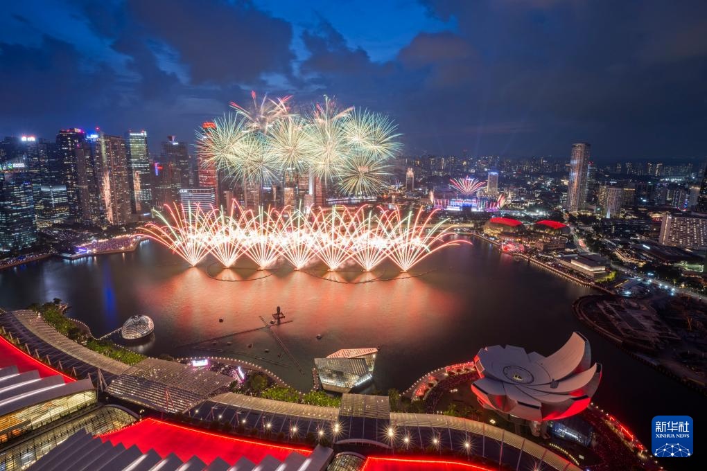 这是8月9日在新加坡滨海湾举行的60周年国庆庆典上拍摄的焰火表演。