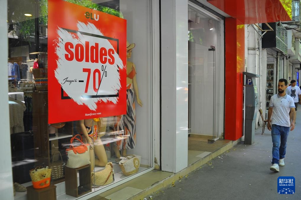 8月9日,在突尼斯首都突尼斯市,行人经过标着“打折”字样的橱窗。