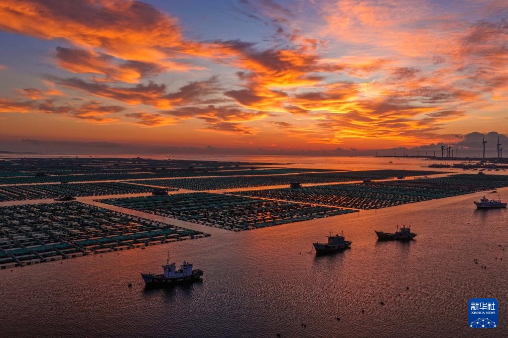 当日,山东省荣成市石岛管理区桑沟湾海域朝霞绚丽,渔民驾驶渔船前往生态网箱养殖区进行秋管作业,海上生产一派繁忙景象。