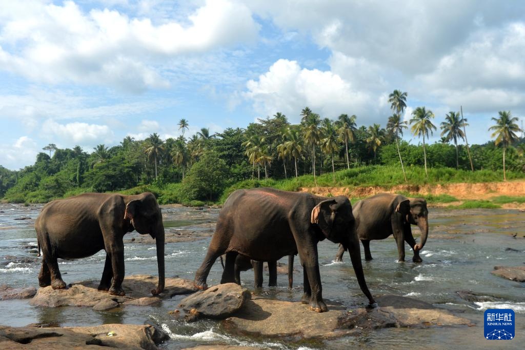 8月10日,游客在斯里兰卡平纳维拉大象孤儿院观看象群。
