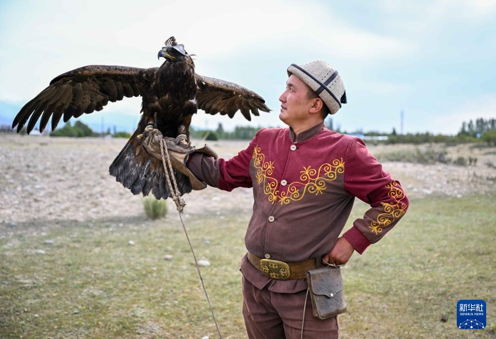 8月16日,在吉尔吉斯斯坦乔尔蓬阿塔附近,一名外国游客体验训练猎鹰。