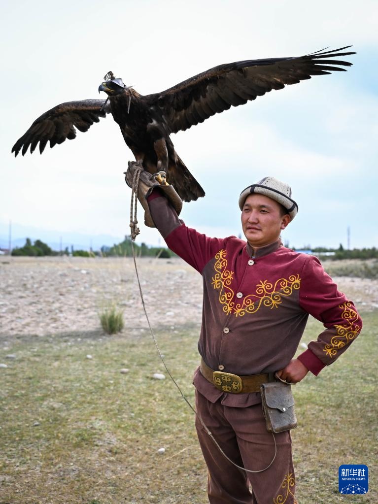 8月16日,在吉尔吉斯斯坦乔尔蓬阿塔附近,猎人努尔苏丹表演狩猎。