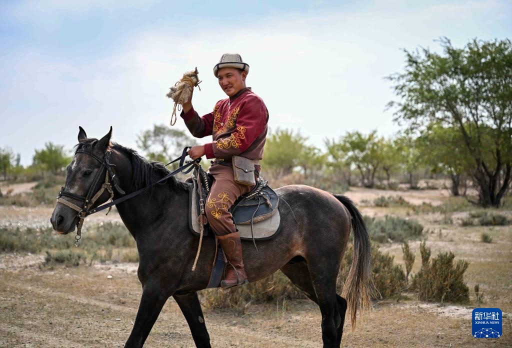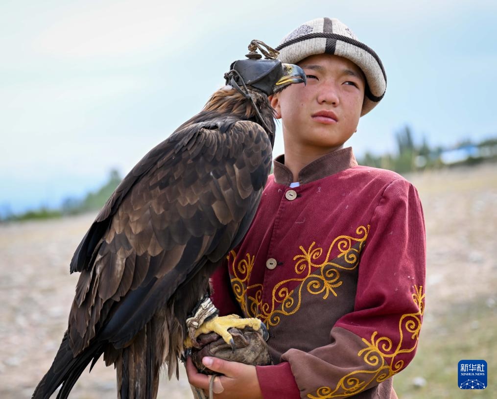 8月16日,在吉尔吉斯斯坦乔尔蓬阿塔附近,小猎人扎帕尔表演狩猎。