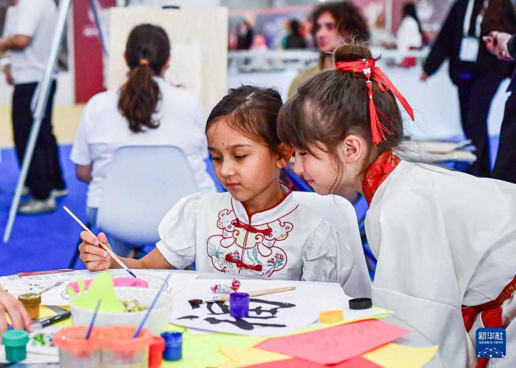 8月18日,俄罗斯小朋友在喀山举行的第三届俄罗斯-中国互利合作“萌芽”论坛上绘制京剧脸谱。