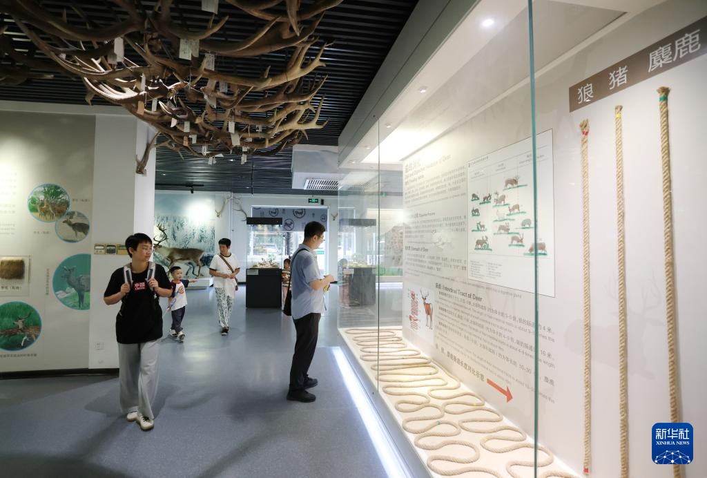 8月24日,游客在北京南海子麋鹿苑博物馆参观了解麋鹿相关知识。