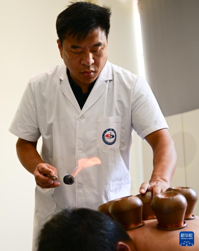 8月27日,游客在位于黄山市屯溪区的新安养生馆体验拔罐。