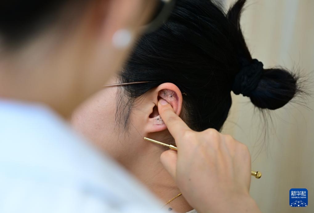 8月28日,游客在位于黄山市徽州区的院藏徽州智慧康养基地里体验耳穴贴压。