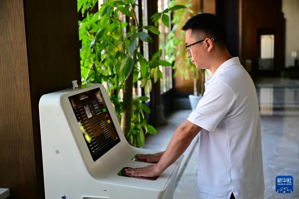 8月28日,游客在位于黄山市徽州区的院藏徽州智慧康养基地里使用智能健康预警系统。