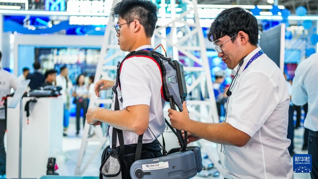 8月28日,南方电网工作人员在数博会上帮观展者佩戴攀登用外骨骼。