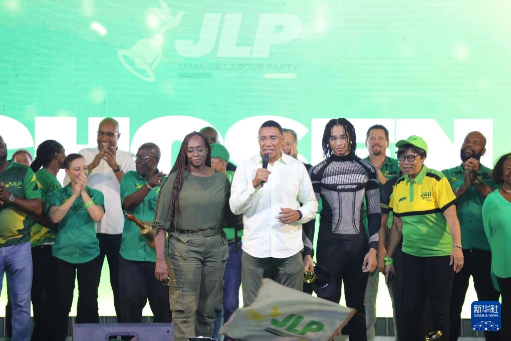 9月3日,在牙买加首都金斯敦,牙买加执政党牙买加工党党首安德鲁·霍尔尼斯(中)发表胜选演讲。