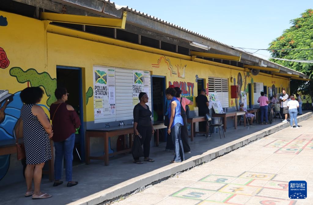 9月3日,在牙买加首都金斯敦一处投票站,选民排队等待投票。