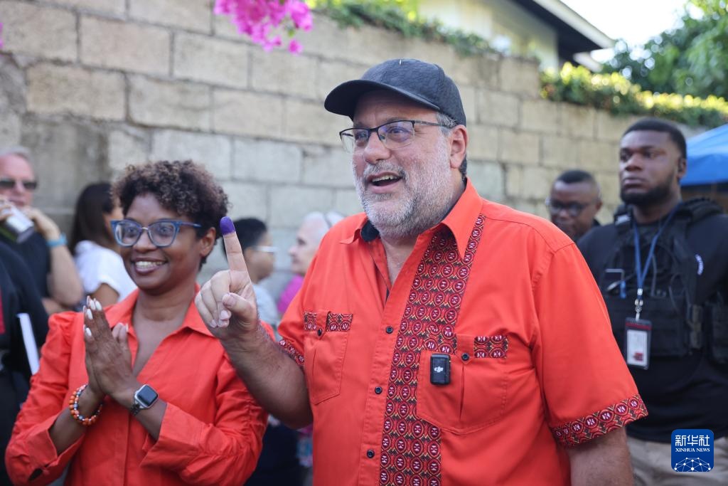 9月3日,在牙买加首都金斯敦一处投票站,牙买加执政党牙买加工党党首安德鲁·霍尔尼斯在投票后展示手指上的墨水。
