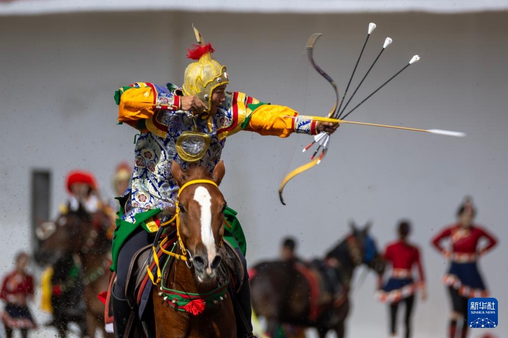 9月5日,骑手在2025年那曲市恰青赛马节表演传统骑射。