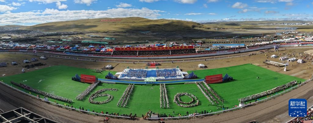 这是9月5日拍摄的2025年那曲市恰青赛马节开幕式现场(无人机拼接照片)。