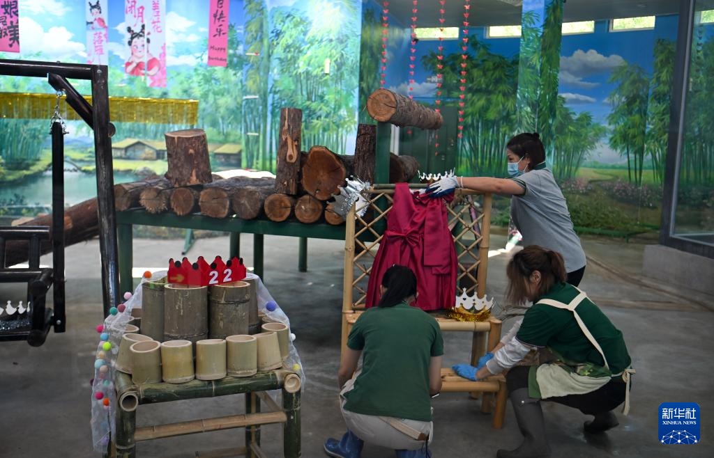 9月6日,在天津动物园熊猫馆,工作人员为大熊猫“格格”准备生日大餐。