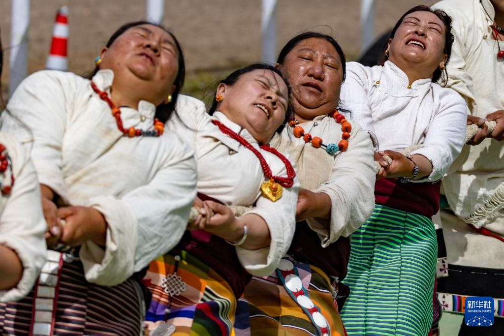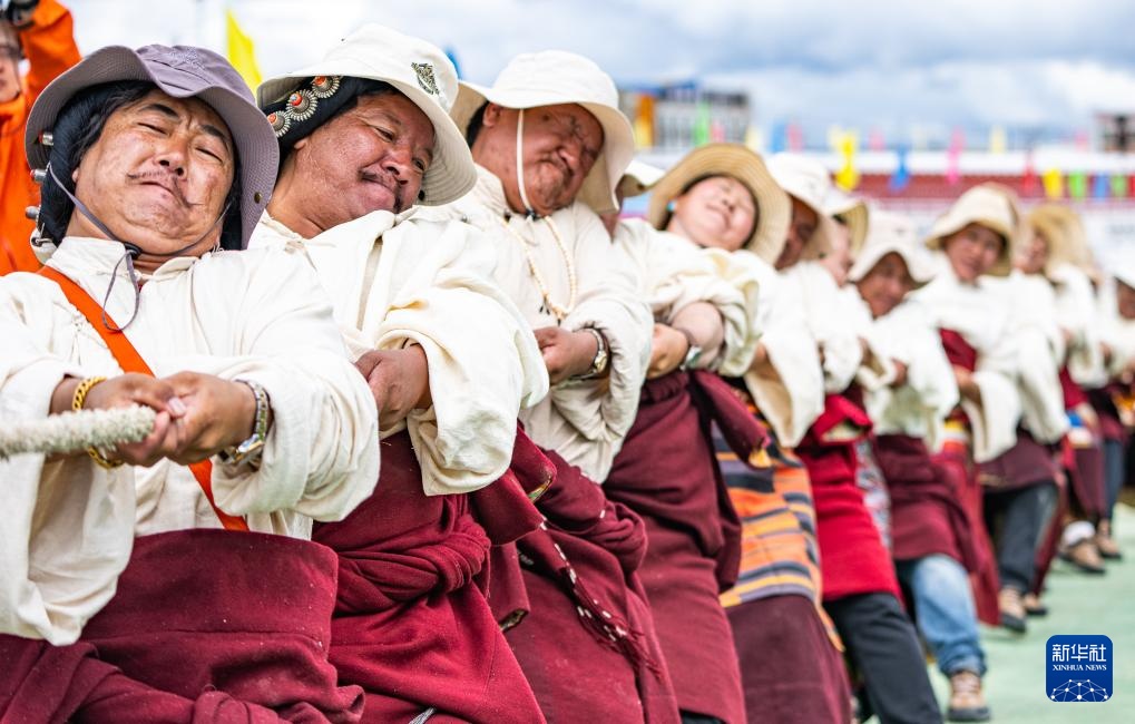 9月6日,在那曲市恰青赛马节现场,选手们参加押加比赛。