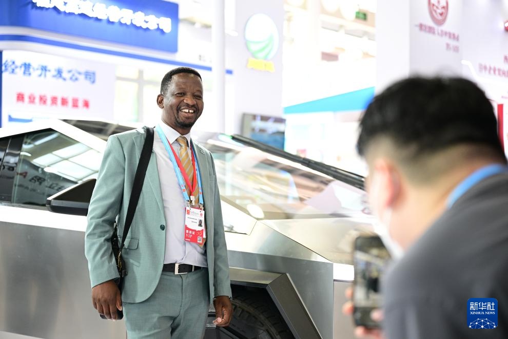 9月8日,嘉宾在投洽会特斯拉展台前留影。