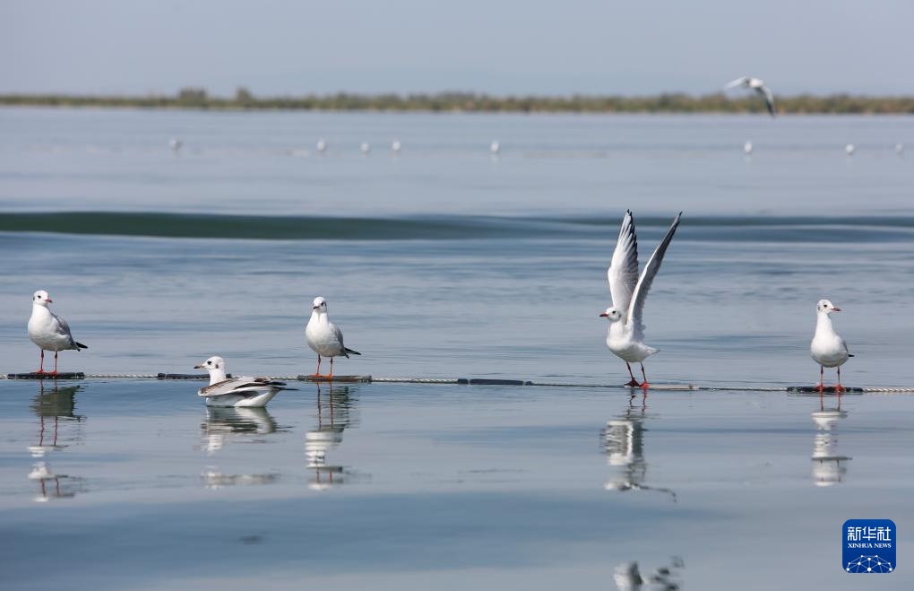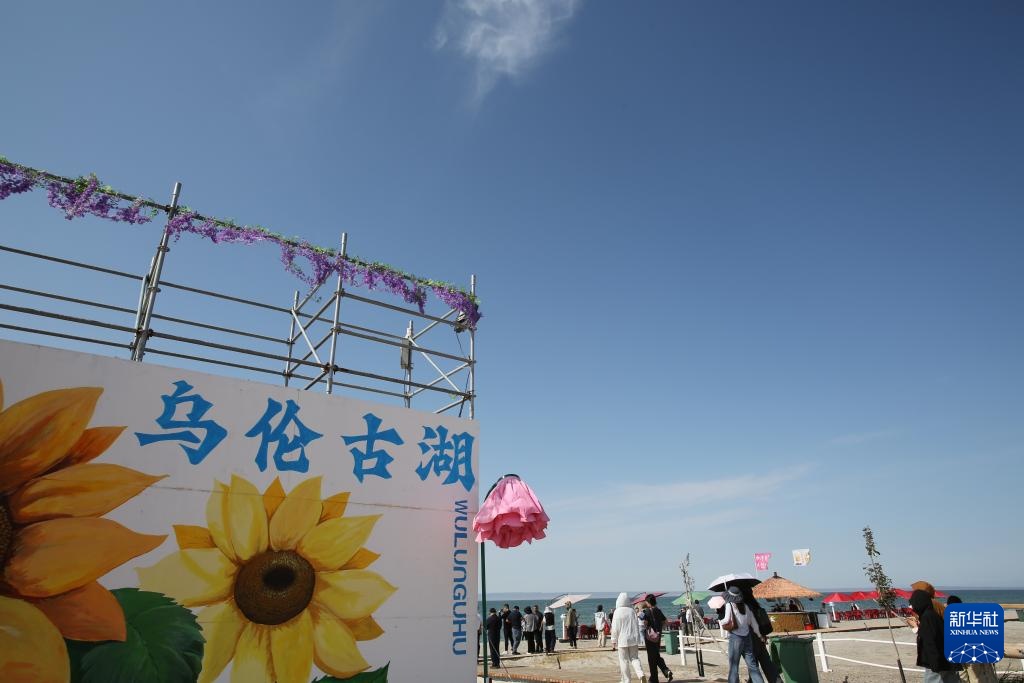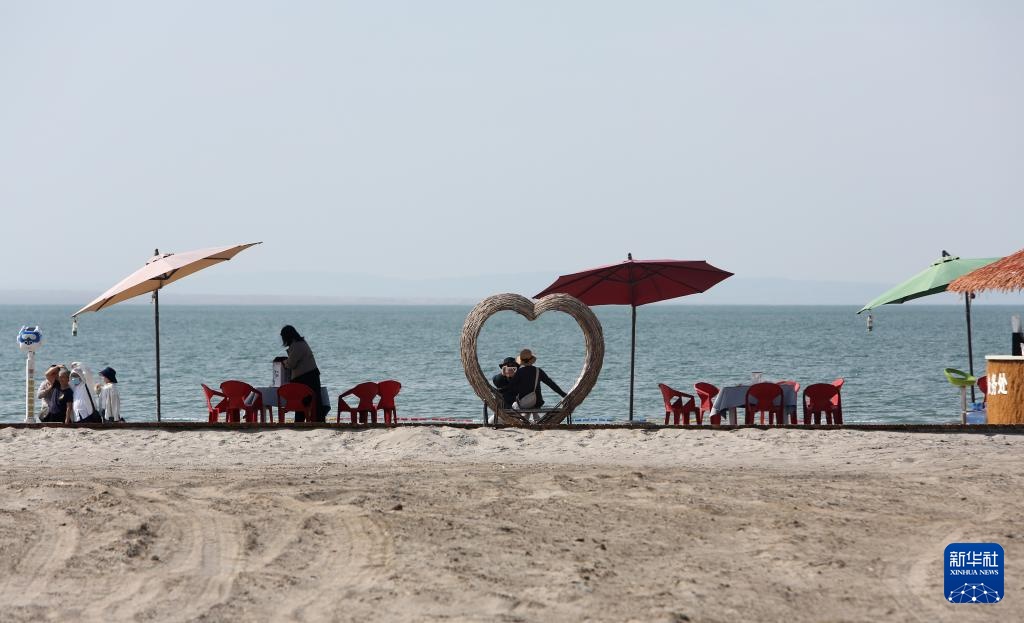 9月8日,游客在新疆阿勒泰地区福海县乌伦古湖金沙滩景区游玩。