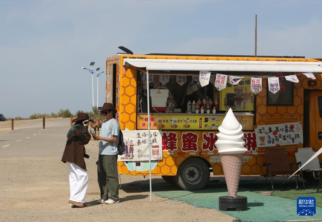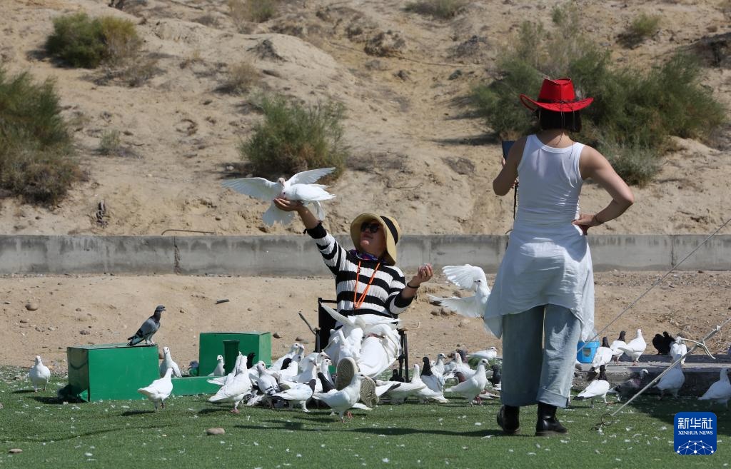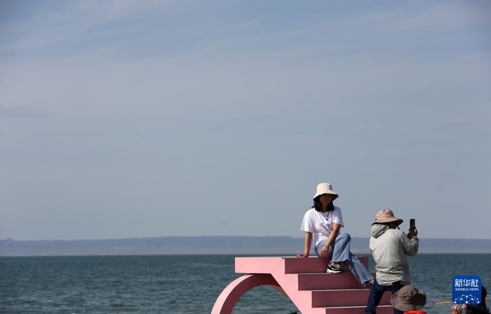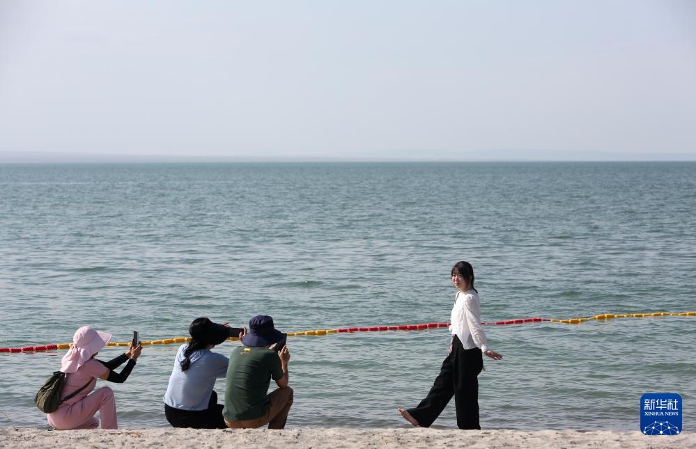 9月8日,游客在新疆阿勒泰地区福海县乌伦古湖金沙滩景区拍照。