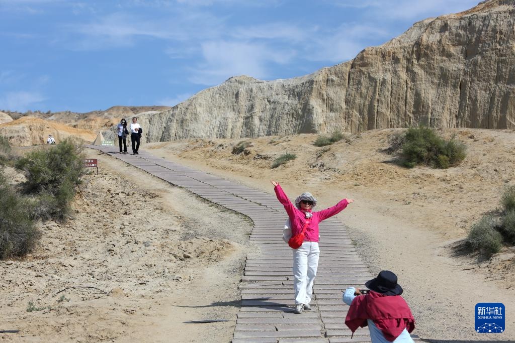 9月8日,游客在新疆阿勒泰地区福海县乌伦古湖海上魔鬼城景区拍照。