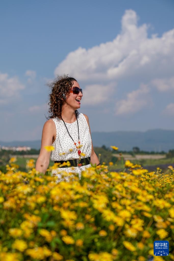 9月8日,游客在东风韵小镇花海中游玩。