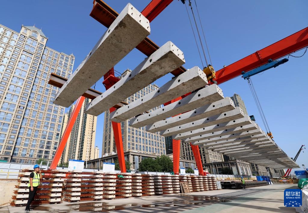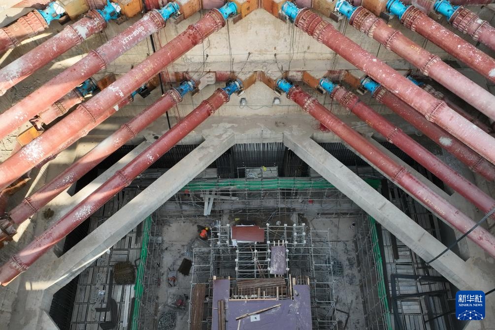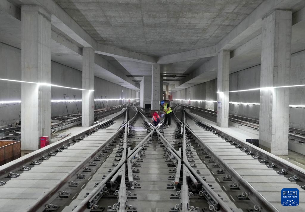 9月7日,工人在石家庄地铁4号线一期工程东垣东路站建设工地施工(无人机照片)。