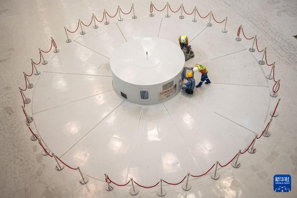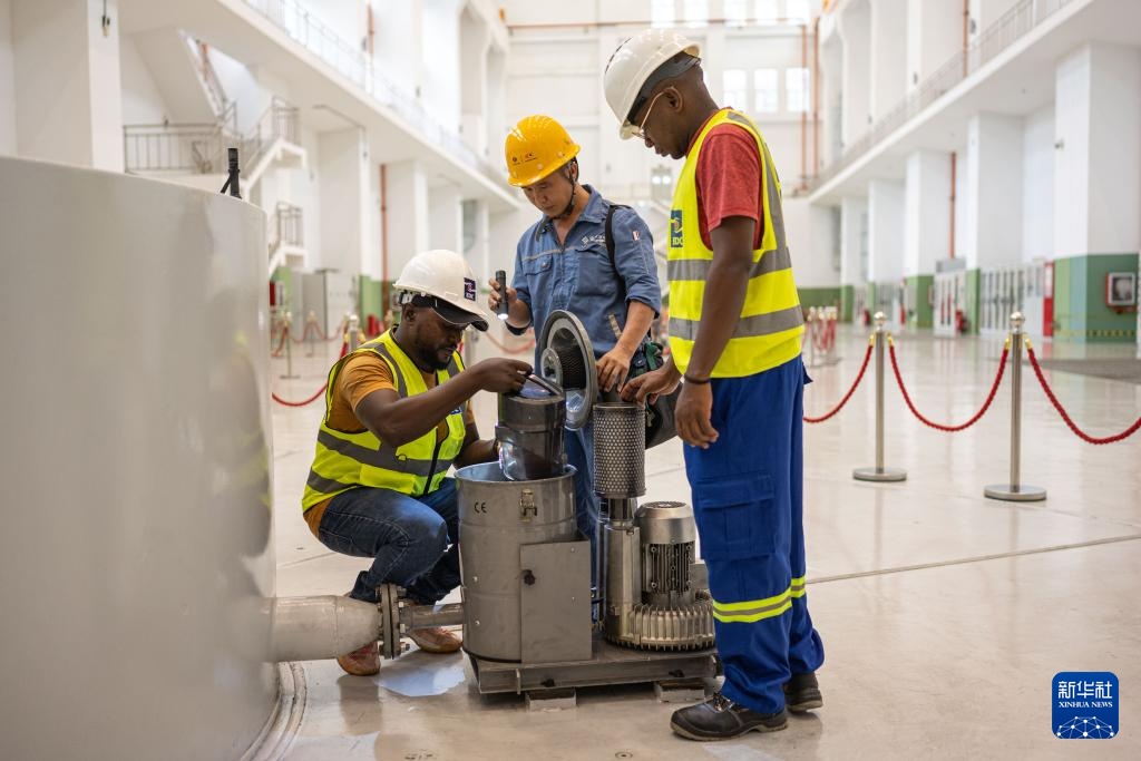 在喀麦隆南部大区的曼维莱水电站,工程师们检查机组(6月30日摄)。