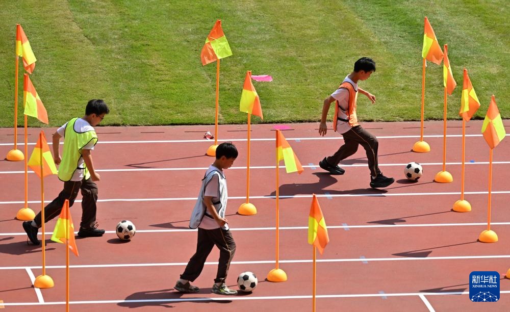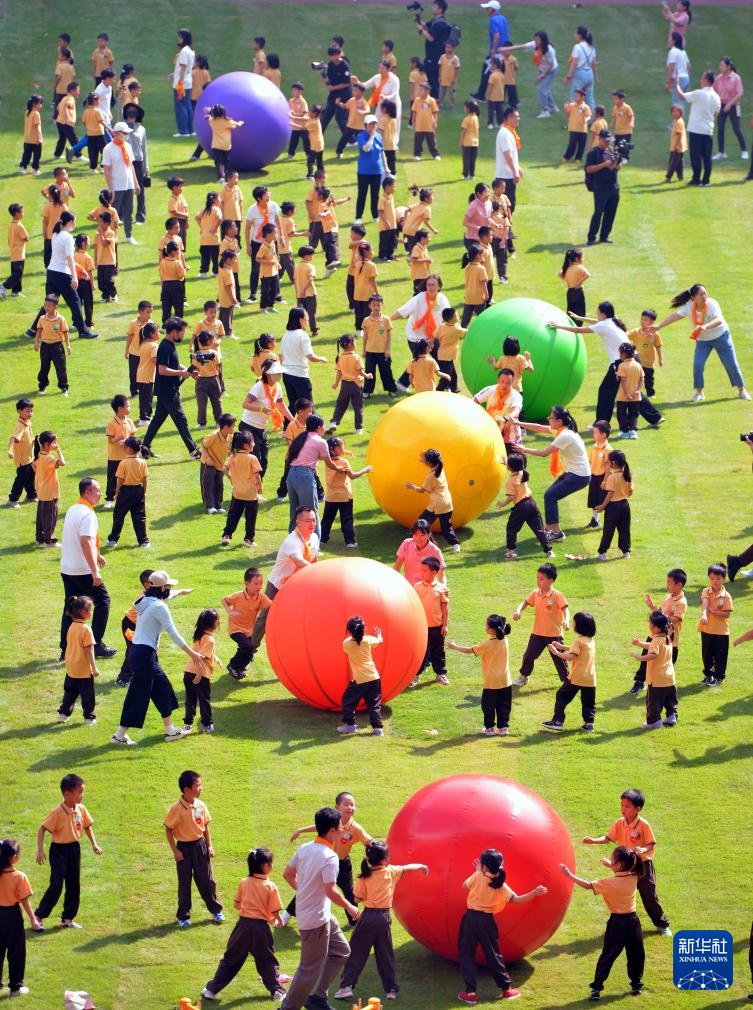 9月9日,在国家体育场,学生们参与“推大球比赛”。