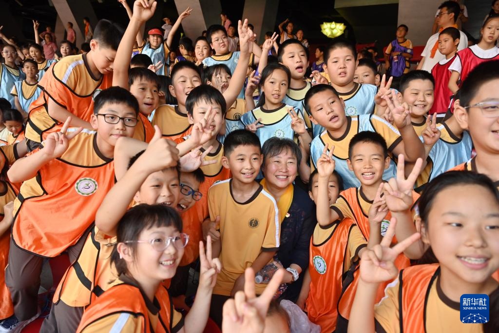 9月9日,在国家体育场,北京第二实验小学党委书记黄利华(前中)展示冠军旗。