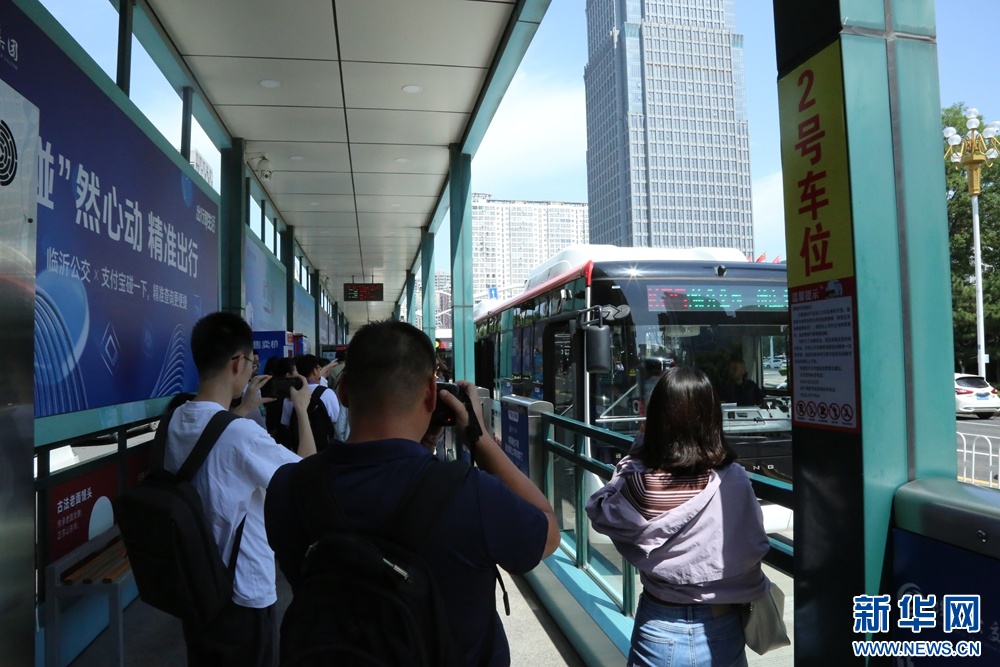 图为9月9日,记者团在临沂公交北京路BRT站台采访调研。新华网记者 雷东瑞 摄