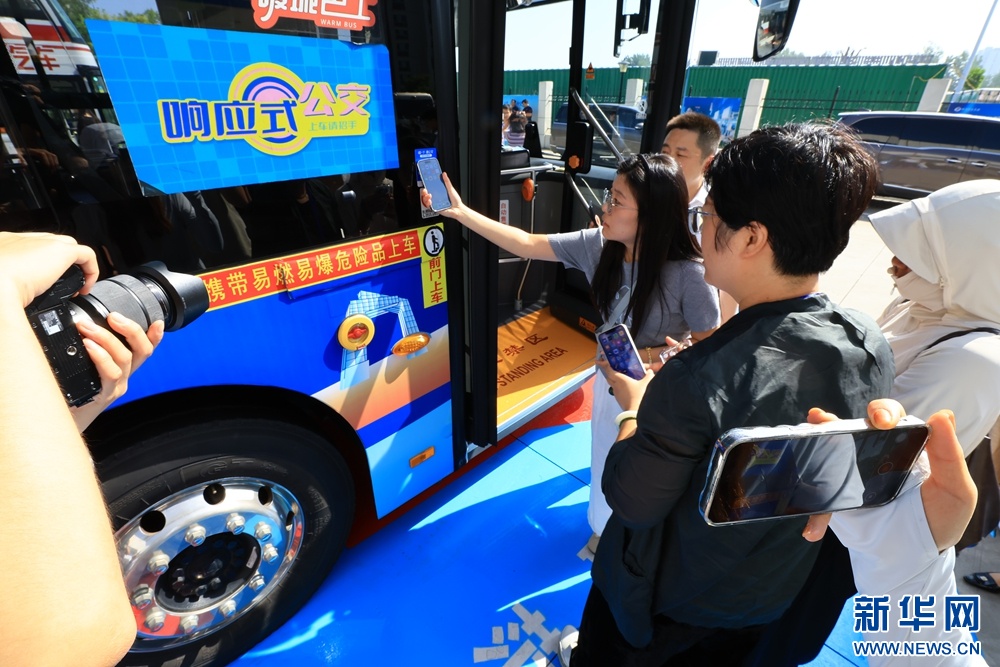 图为9月9日,记者团在临沂公交车上体验“碰一下”查公交功能。新华网发(魏伟 摄)
