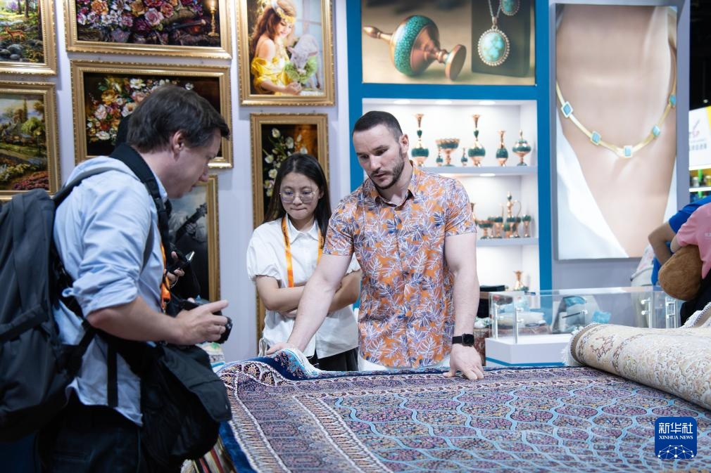 9月10日,参展者在2025年服贸会主题展秘鲁展台参观、咨询。
