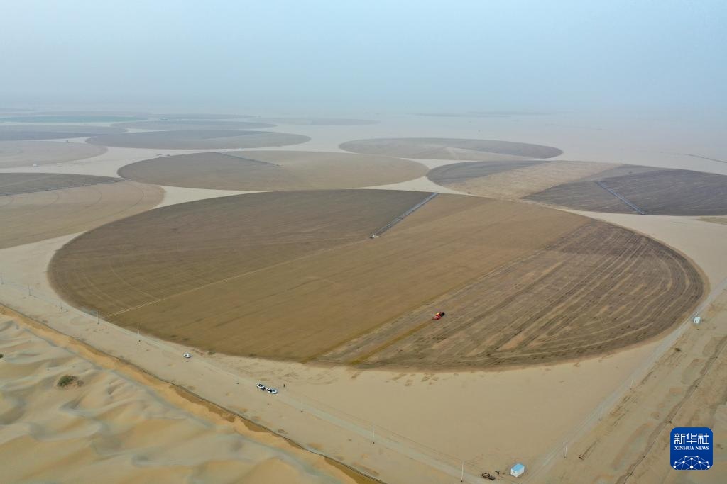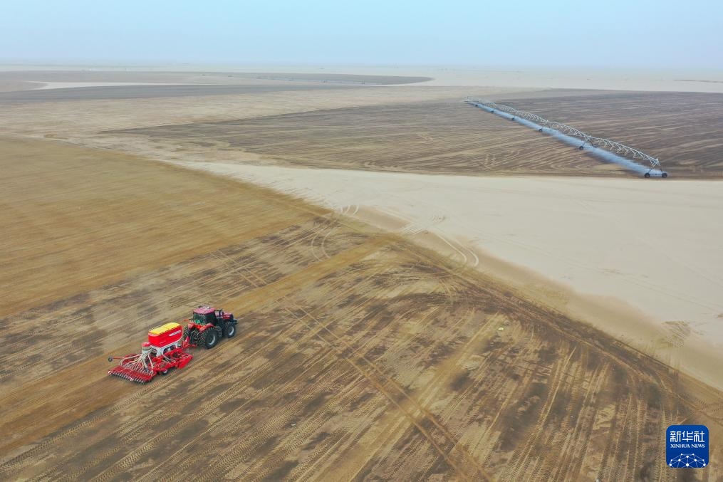 在新疆和田地区策勒县4万亩苜蓿种植基地,农机手驾驶机械在播种苜蓿(9月9日摄,无人机照片)。