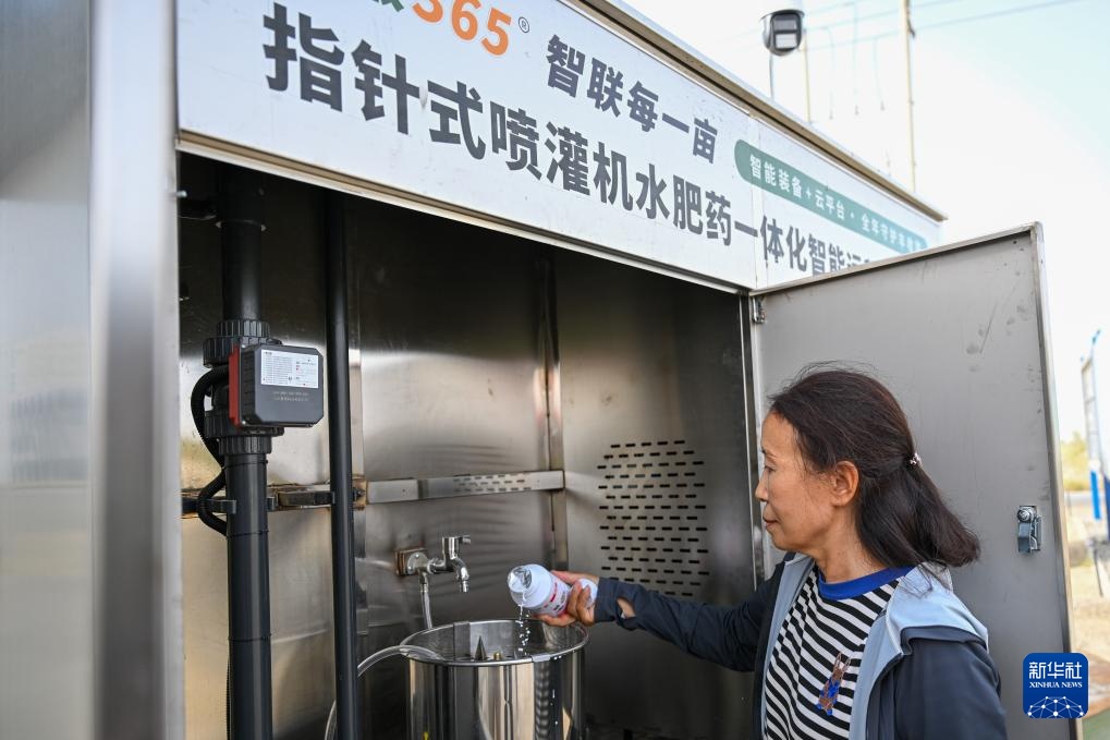 在新疆和田地区和田县千亩苜蓿种植示范基地,技术人员在水肥药一体化智能远程管控终端配制农药(9月10日摄)。