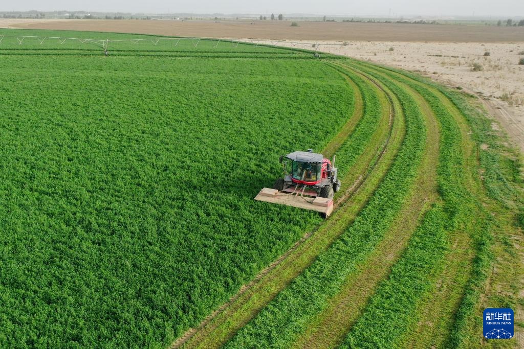 在新疆和田地区和田县千亩苜蓿种植示范基地,农机手驾驶机械收割苜蓿(9月10日摄,无人机照片)。