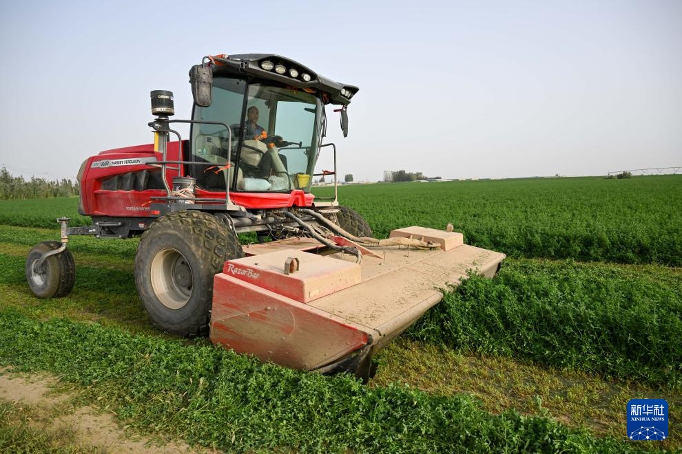 在新疆和田地区和田县千亩苜蓿种植示范基地,农机手驾驶机械收割苜蓿(9月10日摄)。