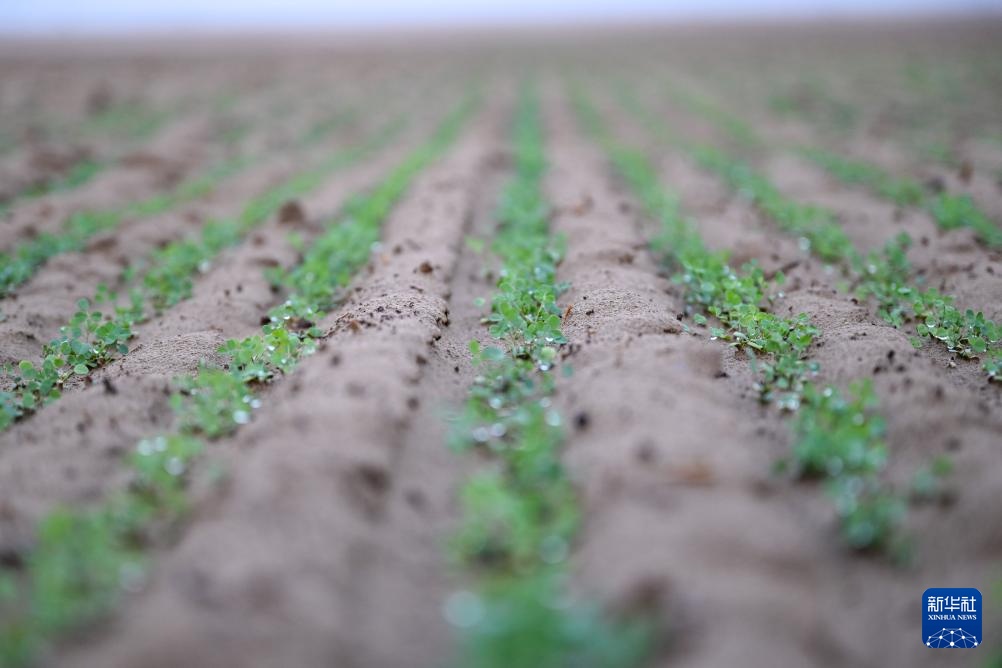这是在新疆和田地区策勒县4万亩苜蓿种植基地拍摄的苜蓿苗(9月9日摄)。