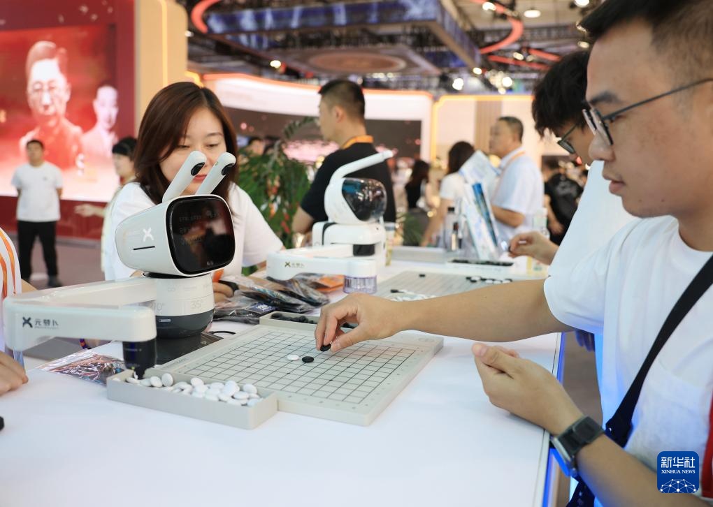 9月11日,一款下棋机器人在文旅服务专题展区与参观者对弈。
