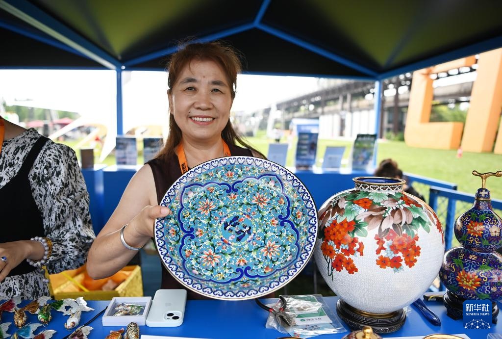 9月11日,在文旅服务专题展区,景泰蓝传统手工制作技艺传承人何爱莲展示作品“五福如意盘”。
