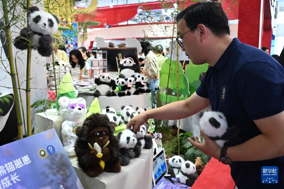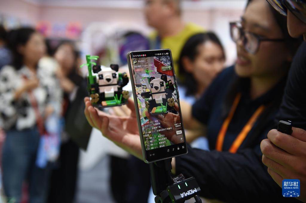 9月11日,在文旅服务专题展区北京市公园管理中心展位,参观者通过直播介绍一款熊猫主题文创产品。