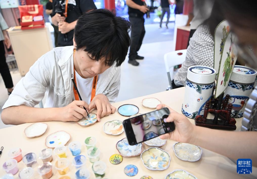 9月11日,在文旅服务专题展区,北京工美的工作人员在画珐琅。