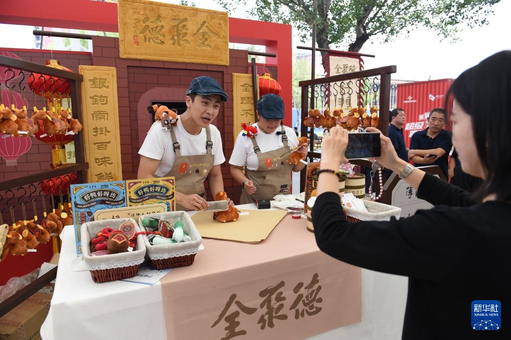 9月12日,参展商在文旅服务专题展区为观众讲解全聚德烤鸭文创产品。