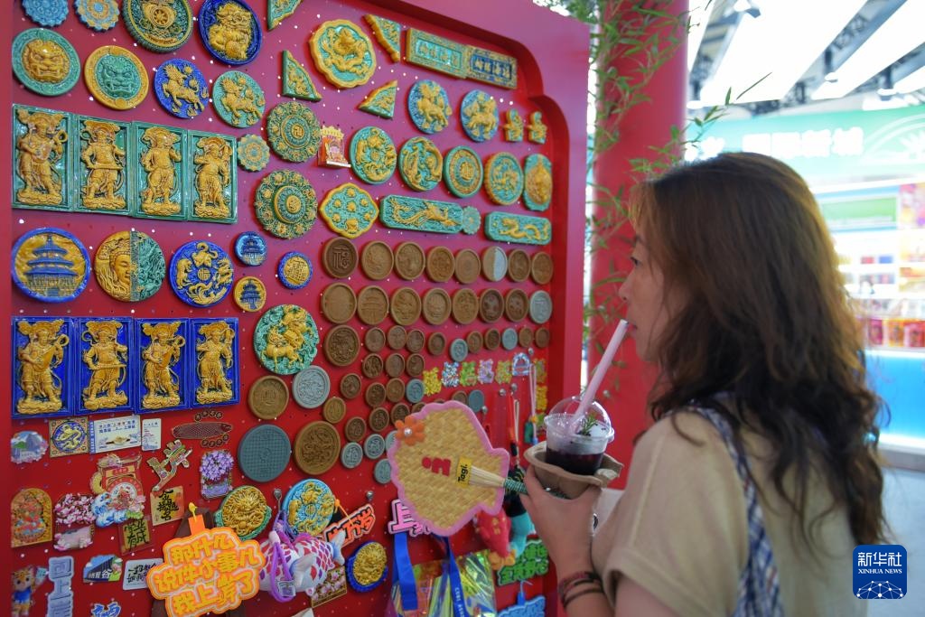 9月12日,参观者在文旅服务专题展区欣赏冰箱贴。