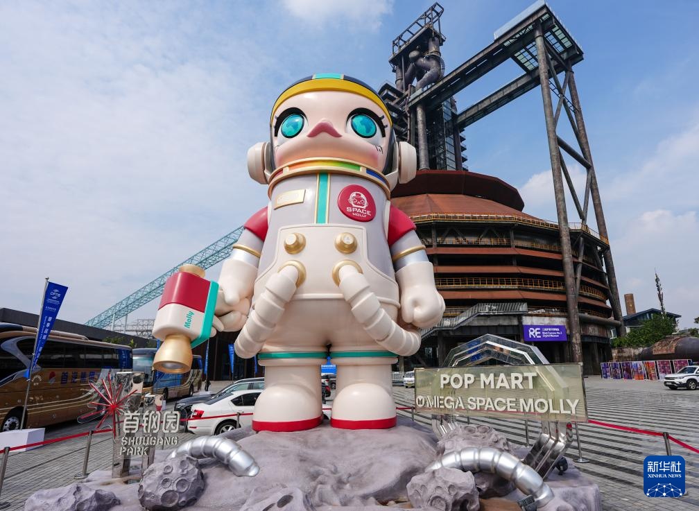 9月12日拍摄的首钢园区三高炉外的泡泡玛特主题雕塑。