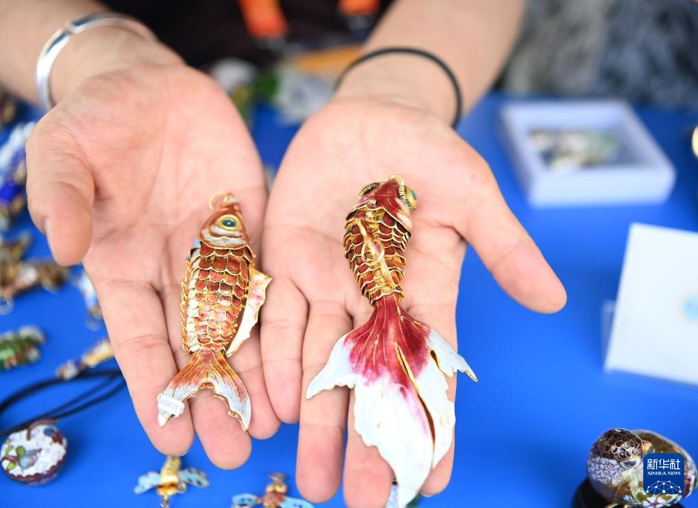 这是9月11日在文旅服务专题展区拍摄的景泰蓝传统手工制作技艺作品“景泰蓝银蓝鱼”。