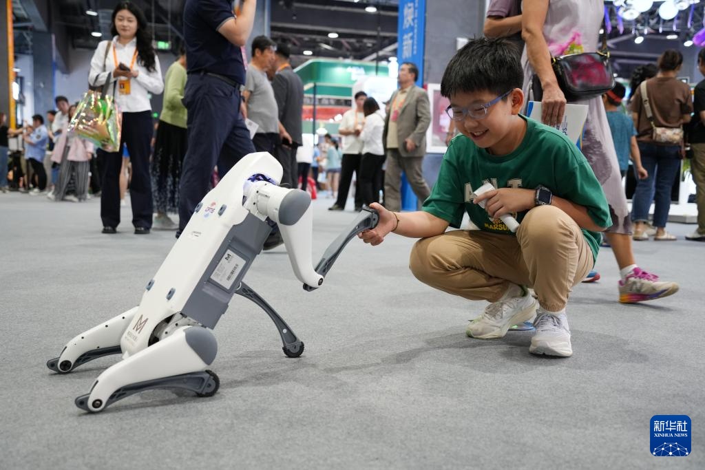 9月13日,小朋友在服贸会展馆内与机器狗握手。