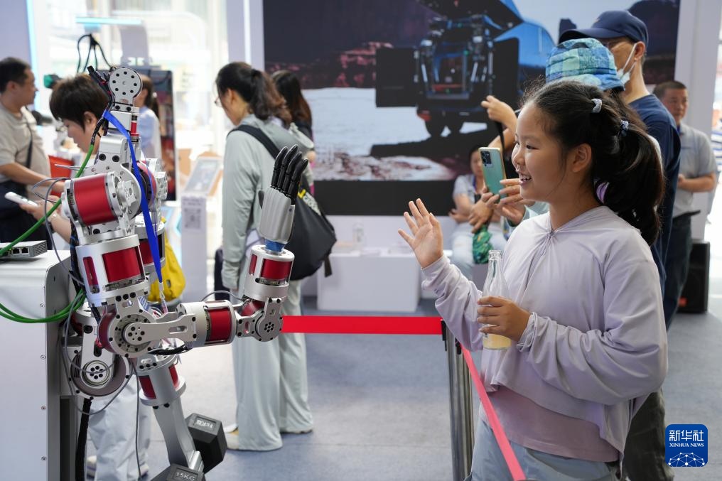 9月13日,参观服贸会的小朋友向机器人打招呼。